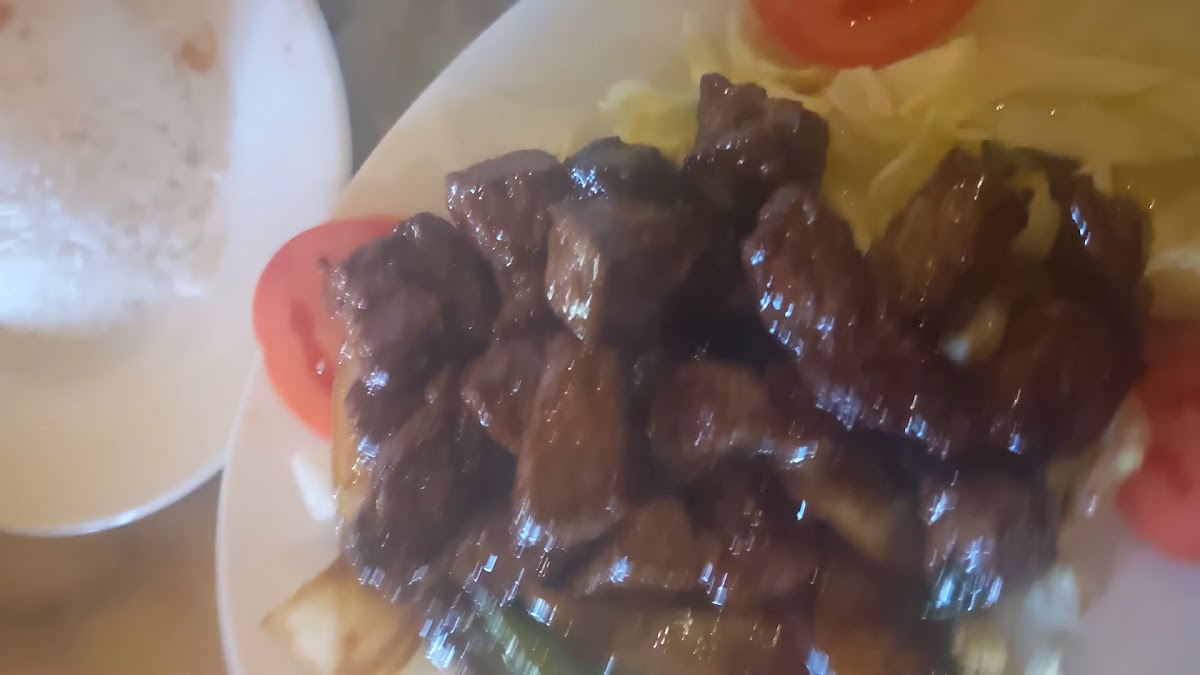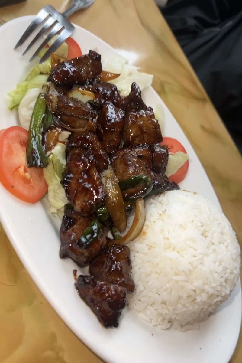 Super good and fast service! Shrimp salad rolls(spring rolls) Combination stir fry Lemon garlic steak rice dish